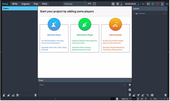 该软件工作流程分为五种不同的模式-设置,写入,雕刻,播放和打印-只需从工具栏上单击鼠标即可随时更改。窗口左侧,右侧和底部的可折叠面板可立即访问每种模式的功能,并且可以通过单击或键盘命令隐藏起来,以在显示屏上显示尽可能多的音乐。