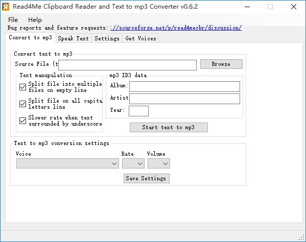 使用此软件工具,您可以在文件浏览器的帮助下选择源TXT,并调整一些可用参数。更精确地说,您可以添加ID3数据(专辑,艺术家,年份),从内置的下拉菜单中选择一种声音,以及调整速率和音量。