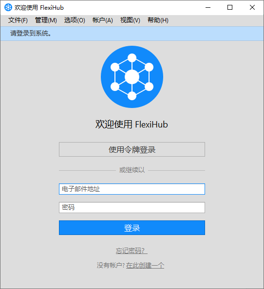 2、软件打开后您会看到这样的界面,使用您创建的FlexiHub帐户登录,远程计算机也执行同样的操作。