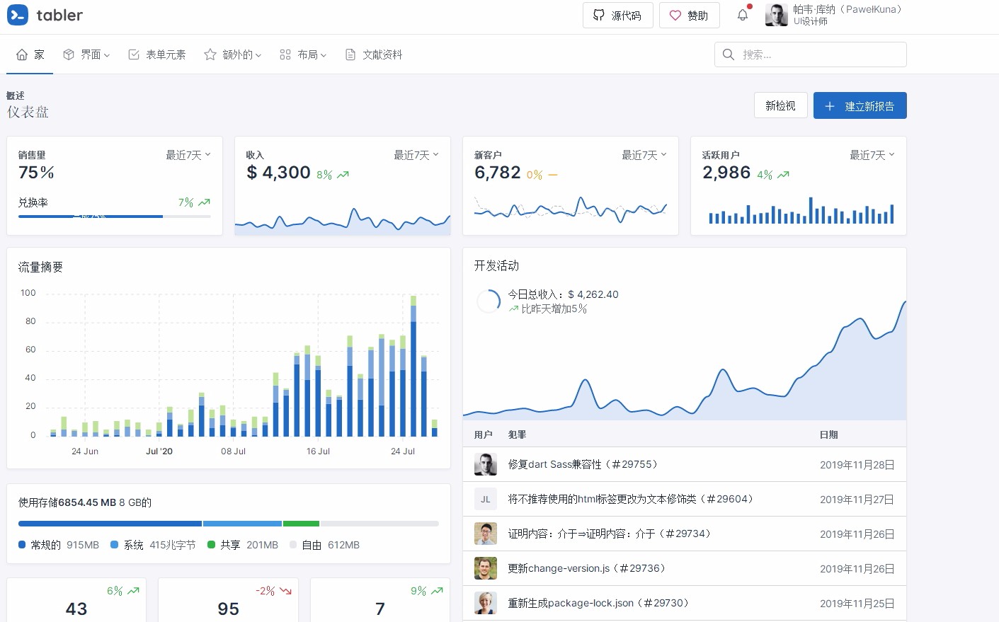 演示页面:Tabler使用各种组件提供超过20个单独的页面,使您可以自由选择和组合。所有组件的颜色和样式都可以变化,您可以使用Sass轻松地对其进行修改。天空才是极限!