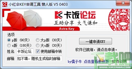 小红伞KEY申请工具V5 0403绿色版可以申请P版/S版/大P版/大S版key,不需要填姓名,地址,电话等等,只需要点2下鼠标,简简单单,KEY就到手了,完全为懒人设计,大家看图。