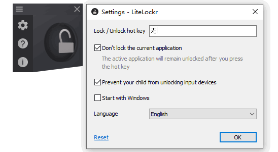 LiteLockr是一款多功能的桌面锁定工具,这款工具可以帮助我们锁定桌面、键盘和鼠标,它主要可以用来帮助用户限制家中小孩使用电脑软件;通过该工具限制小孩使用电脑会让父母更加省心,当孩子在不受监督的情况下使用计算机时,它们无意识的操作可能会对自己造成很大的伤害,比如玩游戏上瘾和误浏览不健康的网站等;LiteLockr是一款小型,免费的便携式桌面锁定软件,旨在为您提供一种快速,轻松的方法来阻止键盘或鼠标等输入设备的使用,通过它可以让您的孩子在指定软件上无法使用鼠标和键盘。