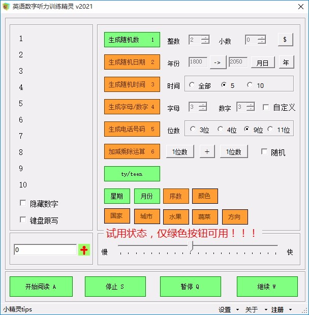 2、可选择生成数字的方式,试用状态下仅绿色按钮可用