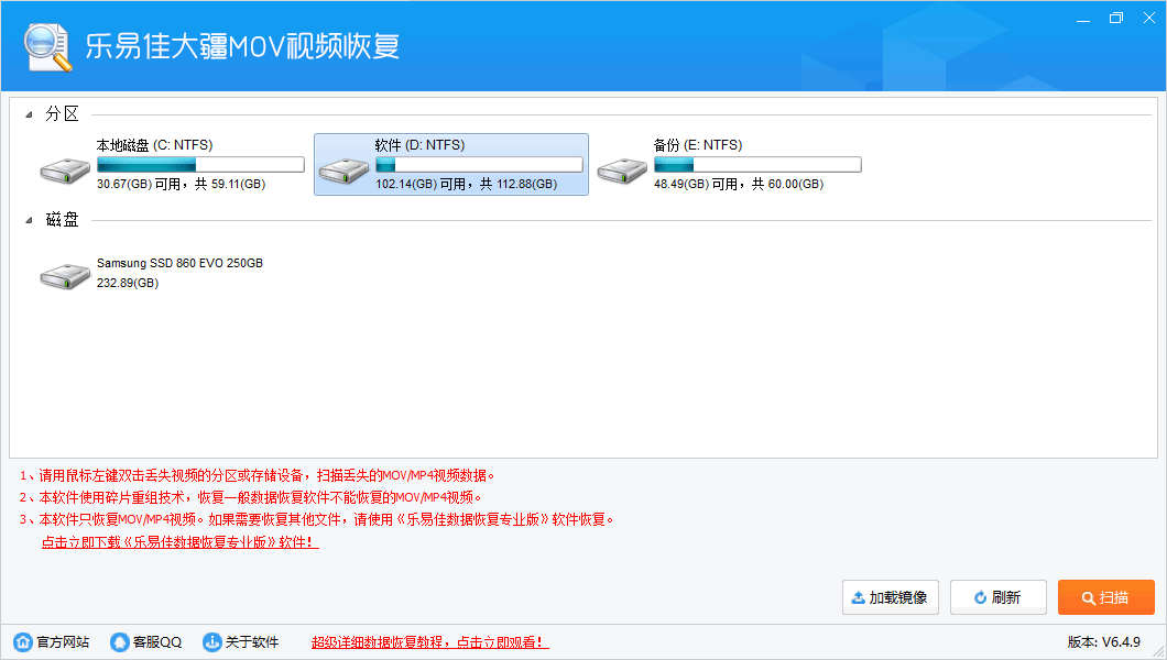 4、可以直接在分区中扫描丢失的MOVMP视频数据,也可以连接相机直接扫描相机。