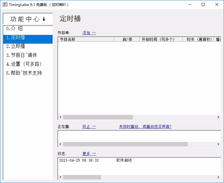 TimingLaba是一款功能强大、简单易用的电脑定时播放音乐软件,使用这款软件用户可以将各种格式的音频文件添加到软件上进行播放,用户可以通过设置播放时间段进行指定音乐进行定时播放,广泛适用于学校、超市、广场等多种场合;TimingLaba界面干净朴素、对用户操作友好,可对添加定时的音乐栏目进行编辑设置,可对批量定时播放音乐进行管理等操作,该软件绿色安全、完全免费,支持开机自启以及海量的音乐素材提供用户选择使用,非常地简单方便,有需要的用户可以下载使用。