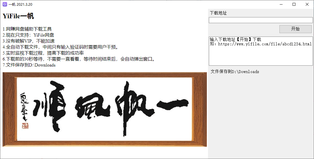 YiFile(一帆)是一款专为YiFile网盘打造的文件下载器,这款软件简单易用,基本上无任何技术要求,用户直接打开后粘贴地址就可以一键下载;这款工具默认的下载地址是D:\Downloads,目前软件不支持修改保存地址;YiFile可以为用户提供一个高效的YiFile网盘文件下载解决方案,采用多线程文件下载技术,下载速度非常快;如果您喜欢使用YiFile网盘的话,那么欢迎您使用这款工具下载YiFile网盘中的文件。