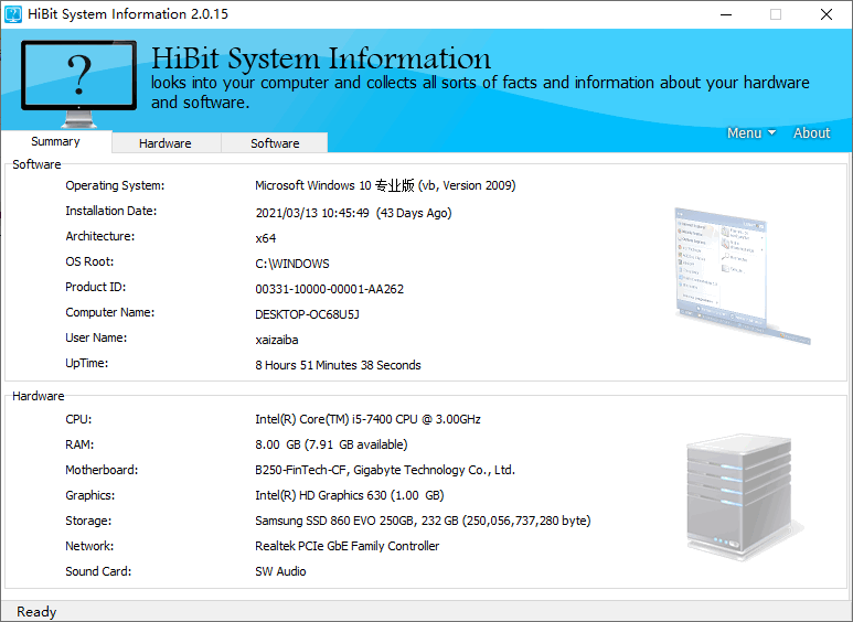 HiBit system information是一个全面的Windows系统信息查看软件,用户可以通过这款工具查看计算机各硬件或软件的详细信息;HiBit系统信息分为几个主要类别,分别是系统的基本概述,CPU,RAM,主板,BIOS,显示,操作系统,安全软件,进程列表,服务等等;软件可以自动检测并采集计算机硬件和软件的重要数据,方便用户直观的了解系统当前的状态,使用户可以针对性的维护计算机;HiBit system information允许您将采集到的系统信息保存为HTML文件,这样即使您计算机小白也可以将其分享给专业人士以获取帮助。