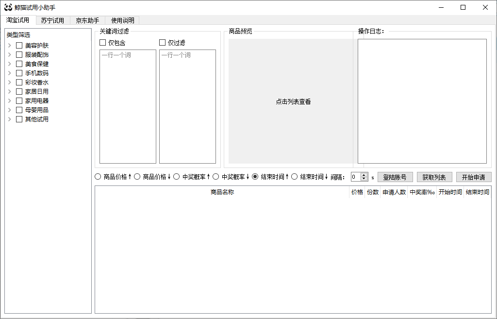 2、这款工具简单好用,要比之前开发的独立版苏宁试用要简单许多。