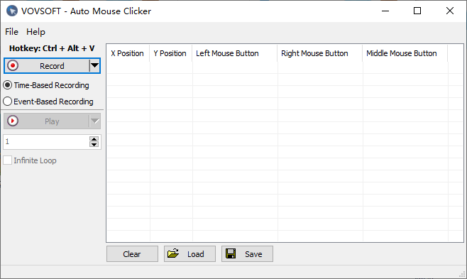 10、在记录窗口的下方有三个按钮,左侧是清除按钮,可以清除录制的鼠标坐标,中间的是加载按钮,可以从本地导入配置文件运行,而右侧是导出按钮,可以将录制的自动鼠标保存到本地,以便下次直接打开使用。