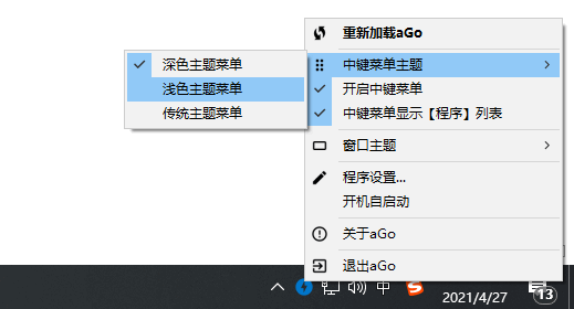 aGo是一个快速启动配置工具,用户可以通过这款工具配置需要快速启动的软件,比如everything等常用软件;这款软件本身的功能并不丰富,用户仅可以通过该工具切换中键主题样式以及窗口的主题样式,不过窗口的主题样式提供了自定义选项,您可以按个人喜好自定义窗口颜色和字体;要将其它软件添加到快速启动项中,用户需要到aGo的配置文件中进行设置,虽然没有直观的用户界面,但配置文本中却有很详细的配置说明,设置起来并不会很难,需要的小伙伴赶紧下载体验吧。