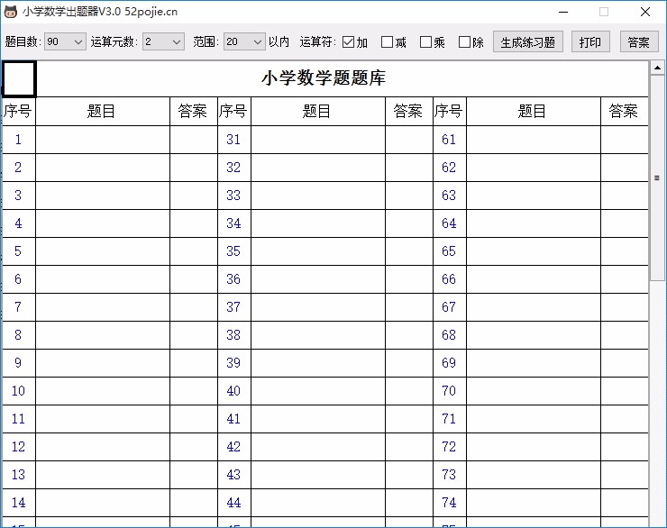 小可数学出题器是一款非常简单且实用的小学数学出题软件,使用该软件可帮助用户快速生成小学数学题,非常适合小学一到六年级的学生进行使用,通过生成的数学题训练自己的计算能力,为以后的数学学习打下坚实的基础,该软件永久免费,不需要注册或购买,您可以自行设置生成的题目数、运算元数、运算符等,按照指定的设置生成对应的练习题,同时还可为每个题目生成对应的答案,使用起来非常方便,需要的话就赶快下载吧!
