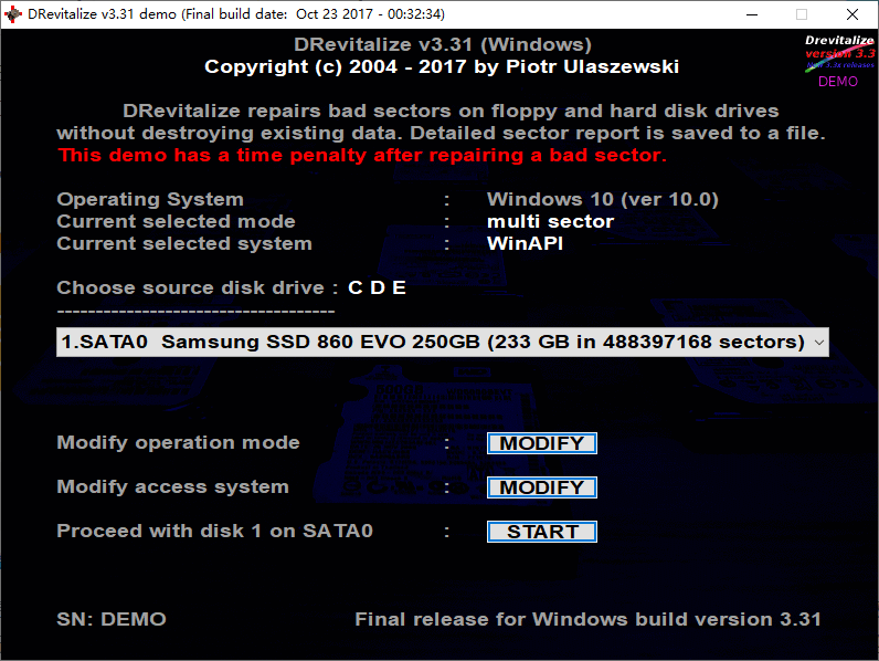 Drevitalize是一款专业的磁盘坏道检测和修复工具,这款工具可以通过在扇区损坏位置产生高低信号的特殊序列来修复磁盘;一般情况下,磁盘扇区损坏后是无法正常使用磁盘的,而很多情况都有可能造成磁盘扇区损坏,比如当磁盘靠近电磁场或是磁盘遭受到物理碰撞时;Drevitalize作为一款专业的扇区坏道修复工具,不仅使用方式简单,而且还支持所有主流的磁盘;该工具修复扇区的效果十分出色,大部分的磁盘坏道问题都可以通过它轻松修复,需要的小伙伴赶紧下载体验吧。