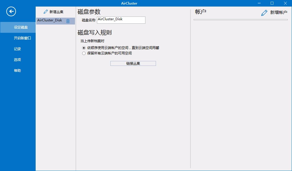 要开始使用Air Cluster,必须创建一个添加所有云的集群,为此,您只需要输入程序,然后在“磁盘配置”屏幕中添加云帐户。