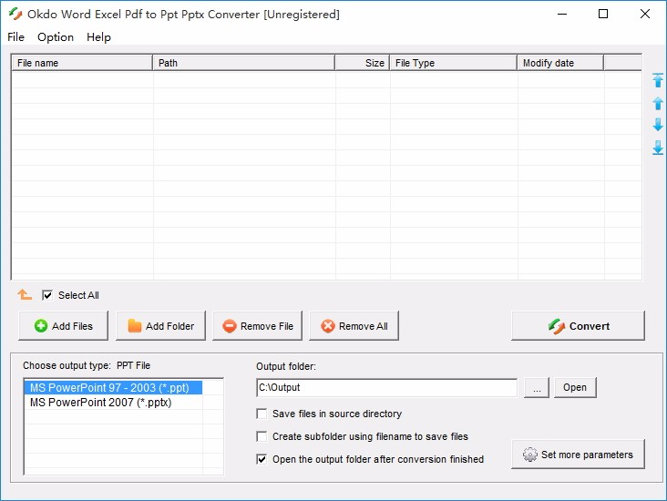 Converter是一款功能强大且好用的文件格式转换器,可帮助用户快速将Word、Excel、PDF文件转换与输出为PPT或PPTX文件,对应的转换操作也非常简单,只需导入符合格式要求的文件,随后选择输出格式并设置好输出目录,一键即可进行转换,为了输出最佳质量的PPT/PPTX文件,可在转换前自行设置转换参数,按照指定的预设设置转换文件格式,使用起来非常方便,同时支持批量转换,总的来说该软件为用户提供了完美的文件格式转换方案,欢迎有需要的用户下载体验