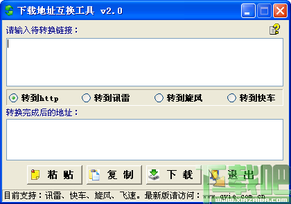 下载地址互换工具在待转换栏中输入地址,可以是http、讯雷、快车、旋风、飞速编码的地址,程序自动匹配转换成对应的http、讯雷、快车、旋风、飞速地址,也可以选择要转换的类型,软件自动转换成对应地址。