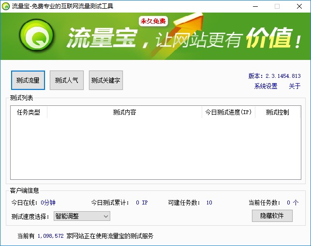 流量宝是一款功能强大、简单易用的网站流量测试软件,内置测试流量、测试人气、测试关键字等三大功能,可帮助用户对网站流量、网站人气以及关键词排名进行查询,适用于模拟测试网站流量可用性、流畅性及稳定性,帮助优化网站访问用户体验;流量宝界面简洁直观、操作简单易使用,内置详细的新手操作教程,即使毫无操作经验的新手小编也可快速数量的使用这款软件,通过该软件用户可以实时测试观察网站流量、人气以及网站关键词排名,便于站长进行网站优化。