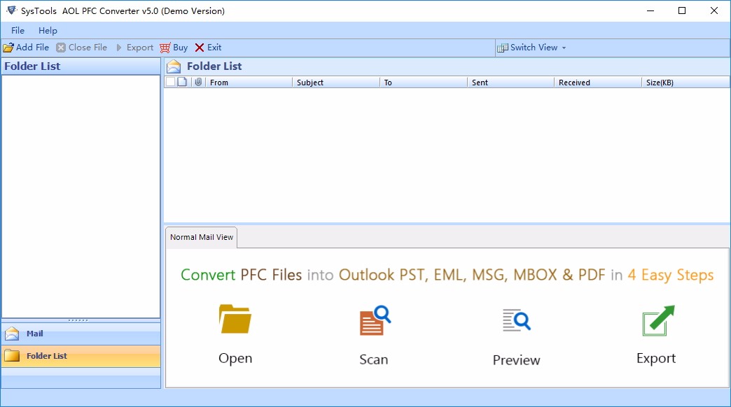 您可以将AOL导出到Outlook PST文件。有一个选项可以使用Outlook进行转换过程。在此功能中,对于PFC到PST的转换过程,Outlook是可选的。该工具提供了“拆分PST”选项,可根据用户指定的大小将大PST分为小尺寸。