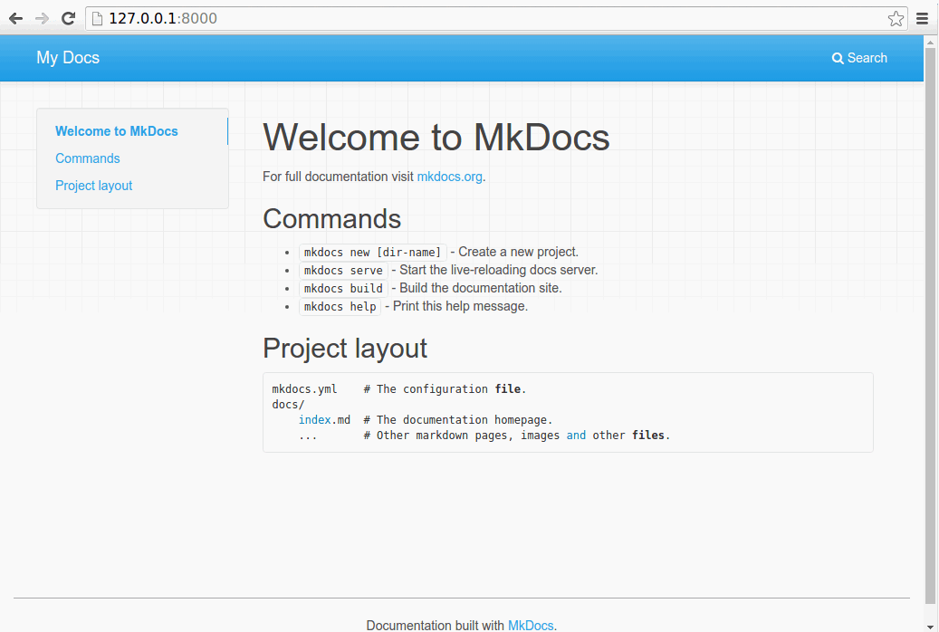 现在,您应该mkdocs在系统上安装了该命令。跑去mkdocs --version检查一切正常。