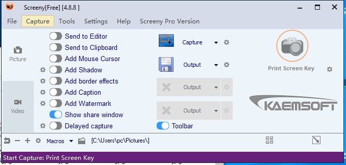 Screeny是一款功能强大、丰富齐全且简单实用的专业屏幕截图软件,通过该软件用户可以对指定屏幕区域截图或者视频录制,该软件支持区域选择、窗口捕获、全屏等10种不同的截图和拍摄模式,用户可以根据实际需要选择相应模式进行截屏或视频录制;Screeny截图的图片和录制的视频文件可通过e-mail发送并上传到ftp服务器,同时该软件还支持专业便捷的图片编辑功能,可以对截图图片进行各种编辑操作,帮助用户优化截图图片,让用户可以得到更完美的图片文件。