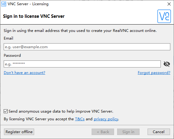 (如果您拥有Enterprise订阅,则可以使用许可证密钥进行脱机注册,该许可证密钥可从RealVNC帐户的“部署”页面获得。)