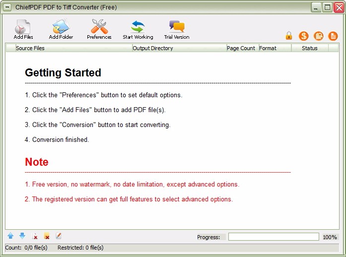 ChiefPDF PDF to Tiff Converter Free是一个非常友好且易于使用的工具,您可以单击“添加文件”按钮以加载pdf文件并选择所需的适当选项,然后单击“开始工作”以完成转换。