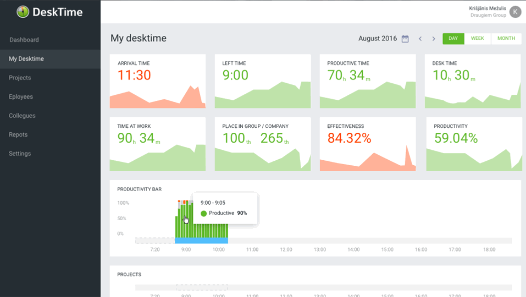 DeskTime是一款功能强大的时间跟踪软件,借助这款软件可以让企业负责人直观查看员工当前的工作状态,方便用户制定更好的工作制度;这款工具除了跟踪用户的工作时间外,它还可以为用户提供许多强大的办公功能,比如它支持制定排班表,记录考勤,集成第三方应用,开票,聊天沟通等等;DeskTime对企业或个人管理时间是很有帮助的,对于自律性比较差的用户,通过这款工具的监控可以记录下用户每天的工作方式,然后再将这些记录生成一个直观的图表,这样就可以直观的知晓员工或自己的工作状态了。