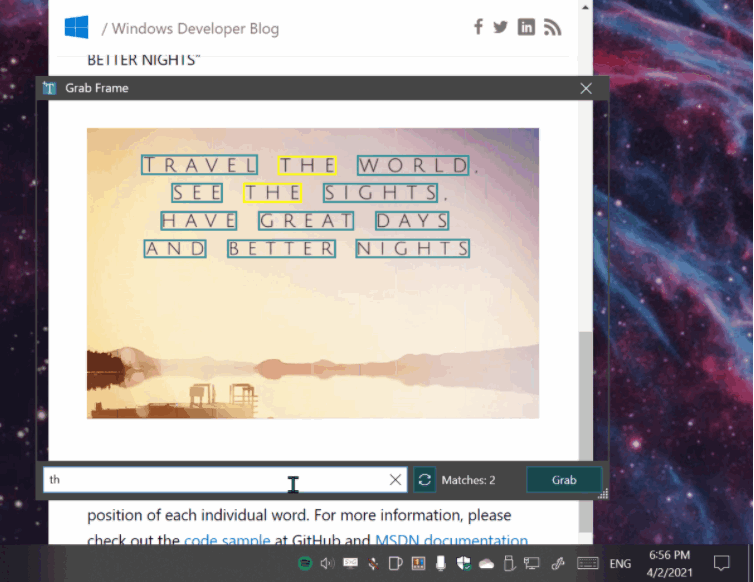 第二个用例只需单击一下,然后尝试复制被单击的单词。之所以启用此功能,是因为Windows 10 OCR API会在每个识别的单词周围绘制一个边框。