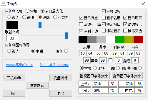TrayS是一个轻便小巧的任务栏管理工具,您可以使用这款工具设置任务栏显示风格,这款工具可以为您提供多种个性化的风格,比如透明,玻璃和亚克力等;除此外它还支持显示流量的使用情况,系统温度的高低和内存使用率等信息;这款工具简单易用,配置方式很简单,通过设置能够让任务栏变得更美观,同时根据显示的系统信息也方便用户日常维护计算机;TrayS是一个免费的开源应用,需要的朋友可以下载体验。