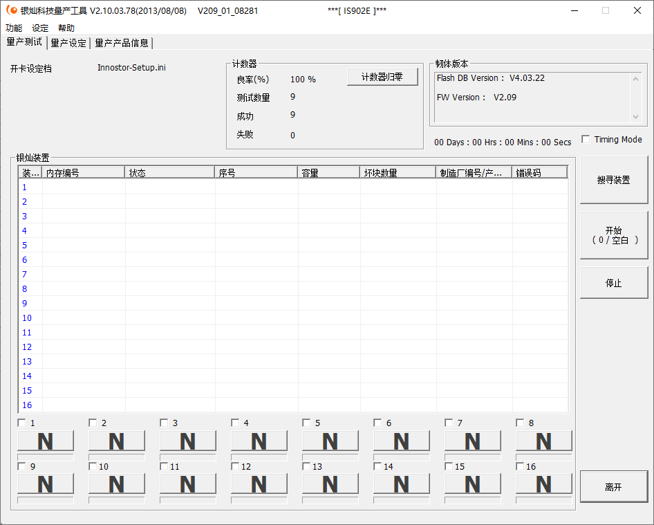 银灿IS902EU盘量产工具是一款专业的IS902E型U盘量产软件,您可以通过这款工具量产U盘、修改U盘信息以及修改U盘等等,量产工具的作用很多,无论您是自己DIY U盘,还是修复损坏的U盘亦或者是格式化U盘都可以使用量产工具完成;这款银灿IS902EU盘量产工具是日本银灿打造的一款U盘量产工具,它支持中文界面,拥有丰富的量产配置选项,使用起来也非常简单;这款工具一次可以量产十六个设备,量产的过程稳定且高效,是目前针对主控型号为IS902E的设备最佳的量产工具之一,需要的朋友欢迎下载。
