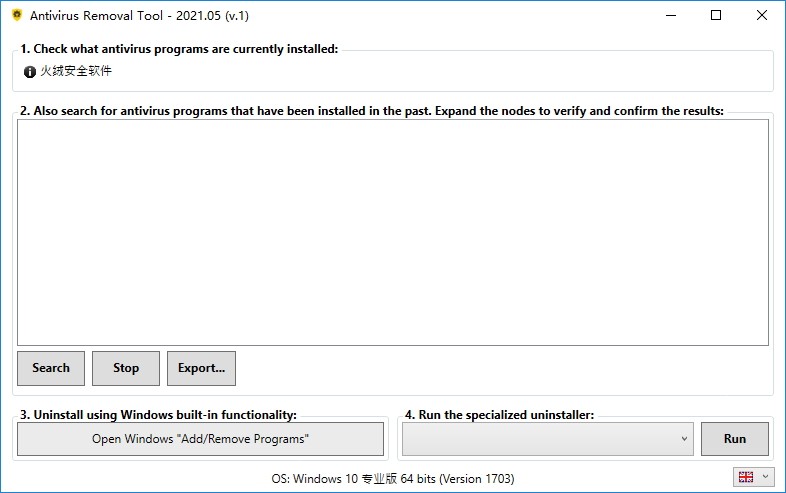–为29个防病毒程序提供官方的专用卸载程序。这些都方便地显示在组合框中,并且可以通过单击按钮来执行。