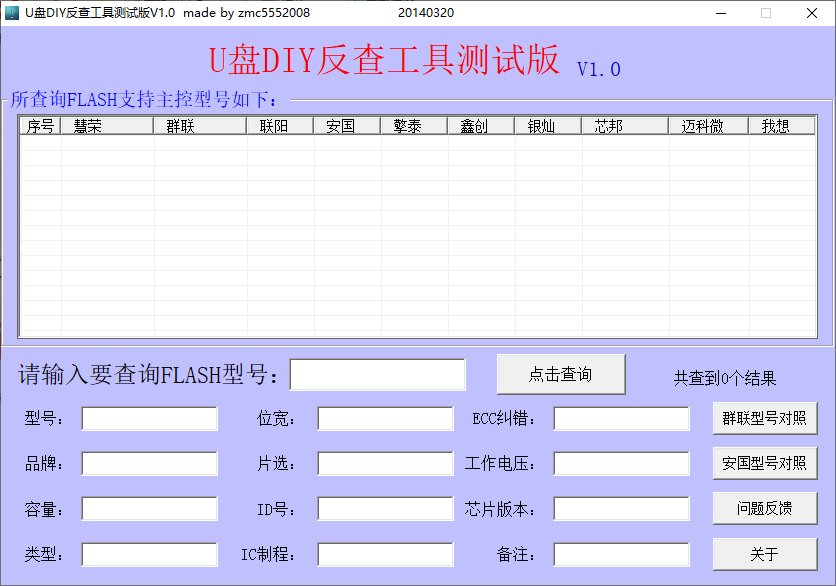 U盘DIY反查工具是一款用来查询U盘主控芯片信息的工具,这款工具的目的是帮助用户在DIY U盘的时能够在U盘中写入对应的芯片信息;很多DIY的U盘信息都比较乱而且还有缺失,别人一看就知道您的USB是自己制作做的;要想使U盘能够实现以假乱真的效果,那么您可以使用这款U盘DIY反查工具辅助您写入U盘信息;该工具简单好用,您只需要输入芯片的型号就可以查询出于该型号相关的U盘编号,制造商以及主控芯片的相关信息;需要的朋友欢迎下载使用。