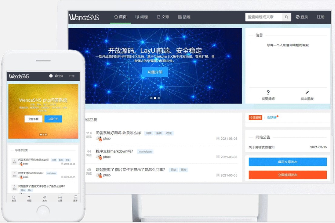 Wendasns 是一款可以帮助用户快速搭建问答社区系统的网站模板,该模板绿色安全、免费开源,可帮助用户搭建属于自己的社区问答网站,完成搭建后的社区问答系统拥有问答模快、文章模快、话题模快、用户管理、邮件设置、问题管理、文章管理、评论管理等多种操作模块,用户可以通过登录网站后台设置更多管理模块,同时可以到网站前台体验网站功能,Wendasns 这款社区问答系统是专门为社区话题讨论而设计的网站模板,其主要目的是激发用户主动创作内容,扩散有价值的信息,增加社区用户的交流。