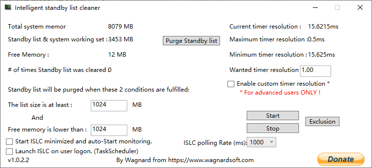 Intelligent standby list cleaner是一款待机列表清理软件,这款工具可以帮助用户监视计算机的内存使用情况,等计算机的内存使用到一定大小后,软件会自动清理内存列表,通过这种方式释放计算机内存来保障计算机的运行速度;很多大型软件或游戏对电脑的资源占用尤为严重,因此用户在运行大型游戏时需要尽可能的释放内存以确保计算机始终保持较高的性能;Intelligent standby list cleaner的配置方式很简单,采用一键式的清理方案,大多数用户都能轻松使用,需要的小伙伴赶紧下载吧。