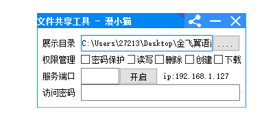 文件共享工具是网友自制的一款文件共享创建工具,这款工具轻便好用,用户可以直接在桌面上启动并创建共享文件;共享文件对提升办公效率有一定的帮助,因此在日常工作中我们会经常使用到这个功能;Windows本身是支持创建文件共享的,但对于新手来说在Windows中创建共享文件会比较繁琐;这款文件共享工具简洁直观,无论用户是否拥有创建共享文件的经验都可以轻松使用;该工具还支持权限设置,基本上可以满足一般用户创建共享文件的需求,需要的朋友欢迎下载。