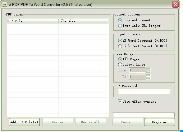 e-PDF PDF to Word converter使您可以用您要处理的文档来建立列表,只需按“转换”按钮即可触发转换过程。