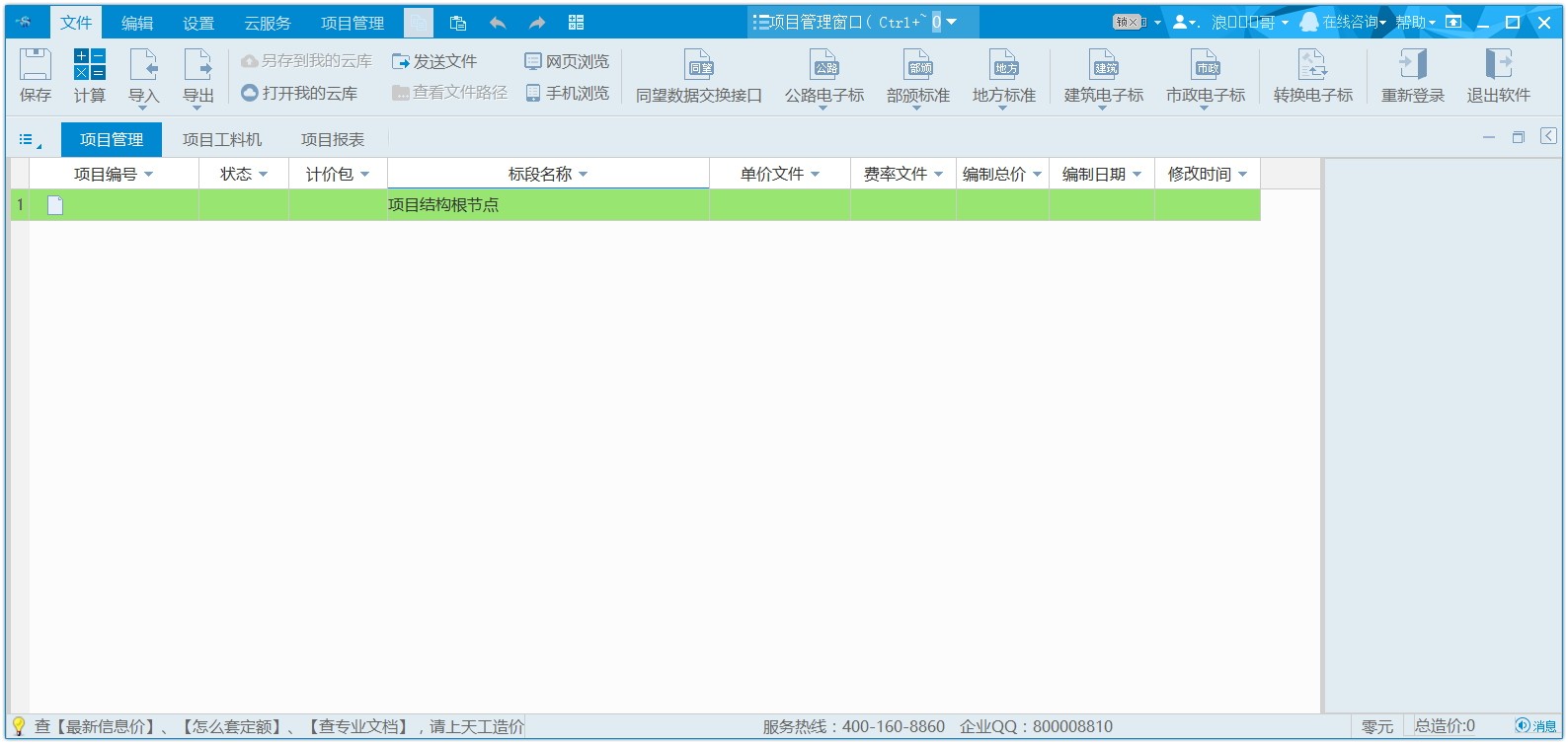 在项目管理界面,选中单价文件,双击或点击工具栏(主菜单)的图标或者右键打开,则,进入单价文件的编辑界面。