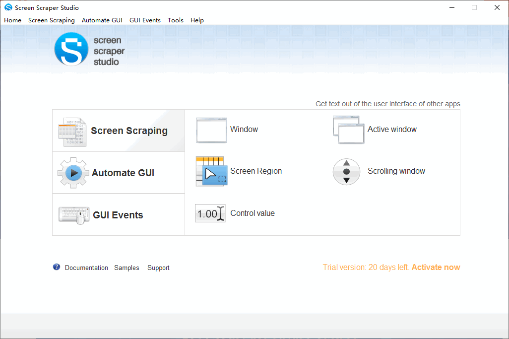 Screen Scraper Studio是一款功能强大的屏幕抓取软件,它可以快速抓取屏幕窗口中的文本内容和图像内容;这款工具拥有极高的图文识别率,可以保证抓取的内容百分百准确,并且文本的识别速度非常快,整个识别过程可以在16毫秒内完成;该工具根据使用场景不同为用户提供了多种屏幕抓取选项,比如您可以选择活动窗口、屏幕区域和滚动窗口等抓取方式进行屏幕抓取;Screen Scraper Studio的功能还不仅于此,它还拥有点击文字、检查控制、点击图片、监控鼠标和热键等功能,这些都可以在我们日常工作中提供很多帮助,对这款工具感兴趣的朋友可以下载体验。