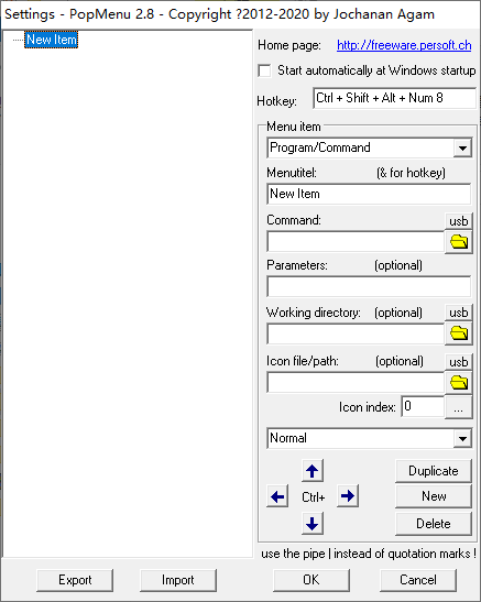 PopMenu是一个可以快速弹出菜单和程序的启动器,这款工具可以帮助用户将常用的程序或命令集成在一个菜单中,以方便用户在需要使用这些工具时可以快速启动;这款软件默认在系统托盘中运行,不会干扰用户工作;当需要使用它时,您可以通过它的“设置”面板配置菜单项和其它的启动项;PopMenu允许您为每个菜单编辑一个名称,并将菜单与所需的图标相关联,这样方便您快速对其进行识别;您还可以将构建的菜单绑定一个快捷键,当您点击对应快捷键时,菜单就会在桌面上显示;菜单包含的条目数量没有限制,您还可以轻松修改菜单的顺序。