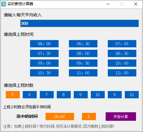 实时薪资计算器是一款日薪计算工具,该工具可以用来计算兼职人员的工资或者自己一天的工资收入;该工具的计算方式很简单,您就只需要设置平均每天的收入情况,然后再按提示设置上班时间和上班的总时间就可以一键获取计算结果;计算机结果可以直观的展示您当前已赚取的报酬,软件能够以毫秒刷新当前的薪酬信息;这为用户带来了更好的交互体验;实时薪资计算器是一个绿色安全的工具,可以直接打开使用,需要的朋友赶紧下载吧。