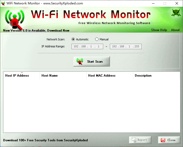 WiFi Network Monitor是一款实用的WiFi网络管理工具,这款工具可以帮助您扫描WiFi并获取WiFi网络的相关信息;这款工具是一个很便捷的工具,您可以自行选择WiFi的扫描方式;它具备两种扫描方式,一种是通过当前的网络自动扫描,另一种是手动配置扫描,无论您通过何种方式扫描WiFi都非常快速;完成检测和扫描之后,WiFi Network Monitor会用户提供一份网络检测报告,用户可以将报告导出到本地,然后再使用支持的阅读器查看报告,一般情况下报告中将包含网络状态、密码以及其它相关的网络信息。