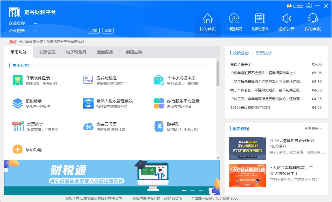 宽谷财税平台是一款功能丰富齐全、专业实用的财税平台软件,内置发票管理、电子税务局、金融服务、便捷查询四大功能模块,其中又拥有众多简单专业的财税管理辅助功能,可为用户提供智能财务、电子发票、智能开票、在线申领发票等一站式财税服务;宽谷财税平台界面简洁直观、操作简单便捷,可轻松实现业务管控、财务记账和税务申报等一体化管理,可满足企业财税业务办理的所有基本需求,彻底解决企业业务办理繁琐的难题,是一款各行企业必备的财税管理软件,有需要的朋友可以下载使用。