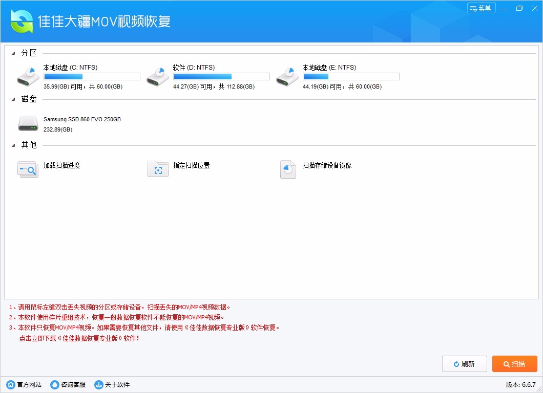 佳佳大疆MOV视频恢复软件是一款非常专业且优秀的大疆MOV视频恢复软件,大疆是著名的无人机品牌,常用来拍摄视频,若您不小心将其拍摄的MOV视频进行删除,或者由于一些不可控因素导致视频文件丢失,这时候就可以用到这款软件,不管是由于何种原因导致文件丢失,都可以使用该软件进行恢复,恢复效果也很好,恢复后的视频文件可正常进行播放,内置了强大的扫描功能,可对丢失的MOV视频进行扫描,您可以在扫描结果中查看可恢复的视频文件,这么好用的软件赶快下载试试吧!