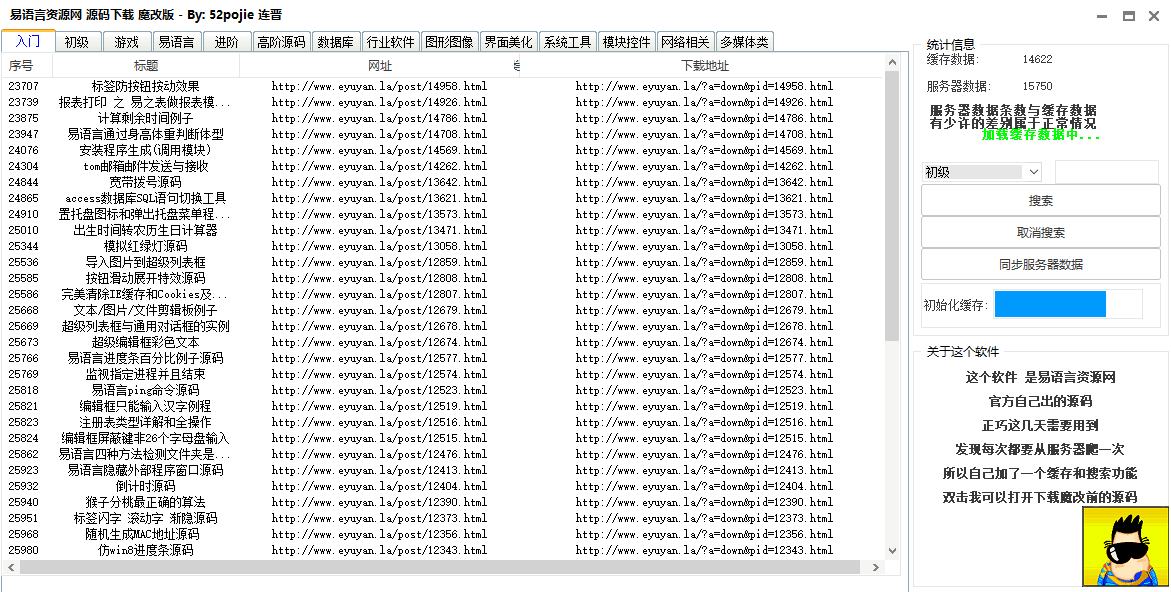 易语言资源网源码下载工具是一款对开发者极为有用的易语言源码查找工具,用户可以通过这款工具在易语言资源网中查找各种项目的源码;很多开发者在开发项目时会在网上查找一些源码使用,而对于易语言开发者来说,大部分会在易语言资源网中下载项目的源代码;这款易语言资源网源码下载工具可以为用户提供一个便捷的易语言源码查找解决方案,您可以通过它轻松找到不同项目的源码链接,通过双击就可以直接访问项目页面并下载源码;这款工具本质上是一个简单的资源搜索工具,在使用上无任何技术要求,需要的朋友欢迎下载。
