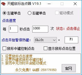 天蝎鼠标连点器是一款非常简单且实用的鼠标连点器软件,使用该软件可帮助用户连续点击鼠标,当我们在玩游戏或者型某些连续点击任务时可能需要连续点击鼠标,若长时间手动进行点击的话可能会造成手酸痛,这时候就可以用到这款软件,借助软件来完成连续点击任务,代替了人工手动点击,具备了左键单击和右键单击两种不同的连点模式,根据实际需求选择连点模式,随后设置点击速度以及点击开始暂停热键,使用指定的热键即可自动执行连续点击任务,需要的话就赶快下载吧!
