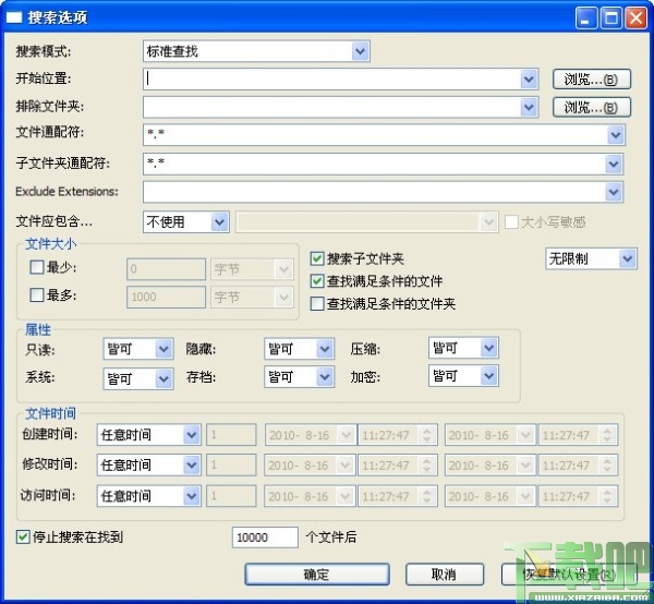 SearchMyFiles是使用系统“搜索文件和文件夹”模块的另一选择。它可以使你很容易的通过通配符、最后修改/创建/访问时间、文件属性、文件内容(文本或二进制搜索)和文件大小来搜索文件。