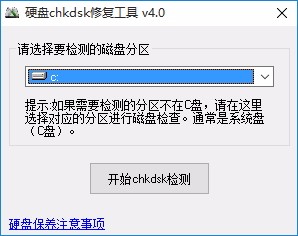 硬盘CHKDSK修复工具是一款非常简单且实用的磁盘坏道修复软件,使用该软件可帮助用户检测磁盘是否出现坏道问题,并可将该问题进行修复,软件体积小巧,但是功能却很实用,打开软件后即可选择要检测的磁盘分区,如果需要检测的分区不在C盘,请选择对应的分区进行磁盘检测,通常是系统盘即C盘,一键即可开始chkdsk检测,检测过程中可弹出命令提示符窗口,按照该窗口中的提示一步一步进行操作即可完成整个修复过程,如果您需要这款软件的话就赶快下载体验一下吧!