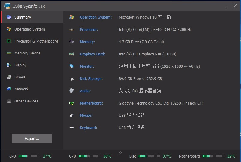8、可显示CPU、GPU、磁盘、主板等温度,直接进行查看