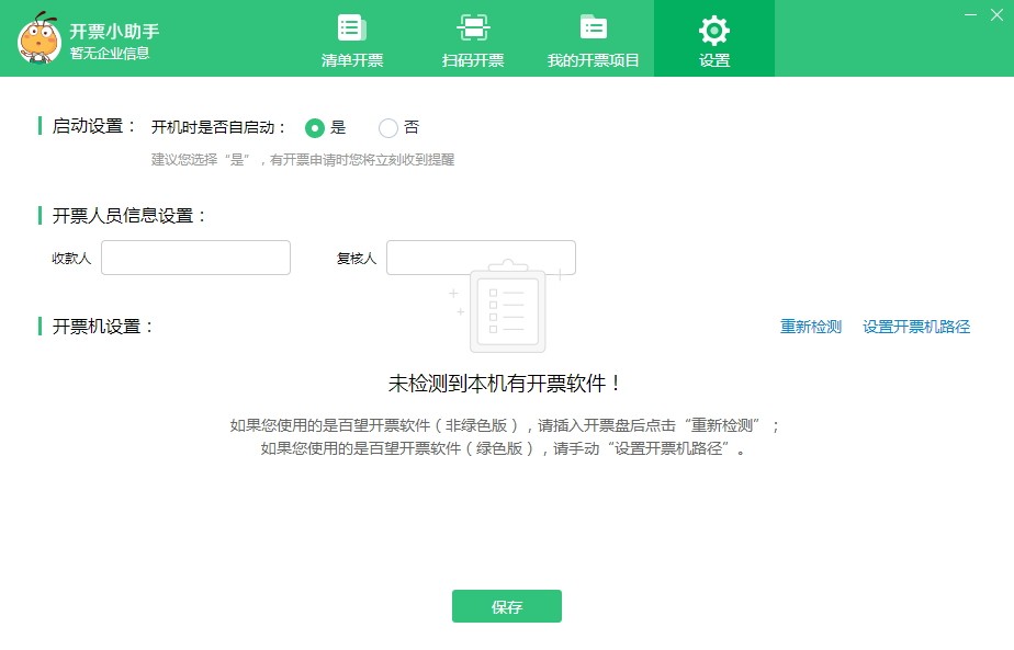4、进入软件设置界面可以对软件启动设置、开票机设置等进行设置和检测