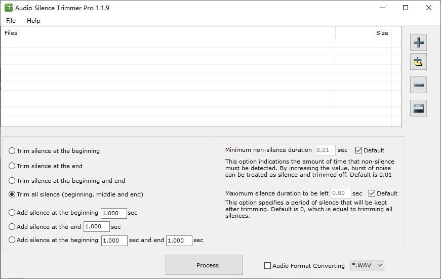 Audio Silence Trimmer Pro是一款便捷的静音消除工具,它可以帮助用户裁剪音频中的静音部分,以让音频文件中的声音可以连续播放;由于录音并非是连续性的,因此在整段录音中可能会出现音频的音频片段,这些片段对用户毫无作用,并且它的存在不但会影响用户收听音频,还非常占内存;Audio Silence Trimmer Pro可以为用户提供一个高效的静音剪切方案,通过简单的配置就可以将音频中的静音部分剔除;这款工具的操作方式并不会很难,但对音频的裁剪程度需要有比较精准的把握,毕竟这款工具不提供可视化的音轨窗口。