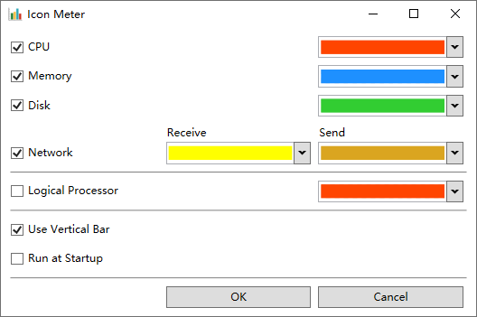 Icon Meter是一款便捷小巧的系统性能检测软件,它可以帮助用户实时检测系统性能,包括CPU、内存、磁盘、网络流量的使用情况;该工具在运行后会在任务栏上显示一个小图标,在图标中您可以看到几种颜色显示条,这些显示条代表的就是内存、CPU等系统性能的使用情况;您可以在它的设置面板中自定义显示的信息和显示的颜色等;Icon Meter其实功能并不丰富,除了能够提供直观的系统性能显示之外就不含其它功能了;需要的朋友欢迎下载使用。